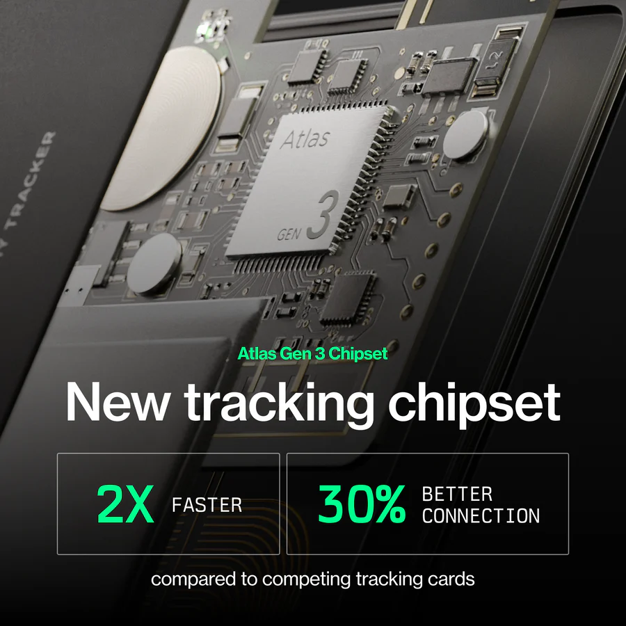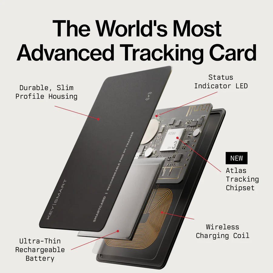 - Ultra-thin tracking card (~2 credit cards thick, <0.8”)