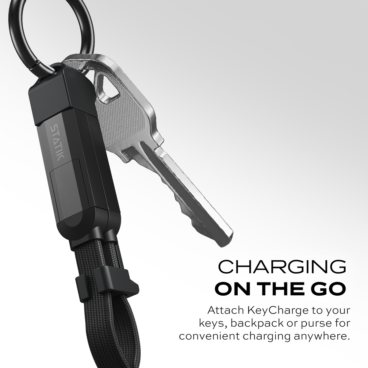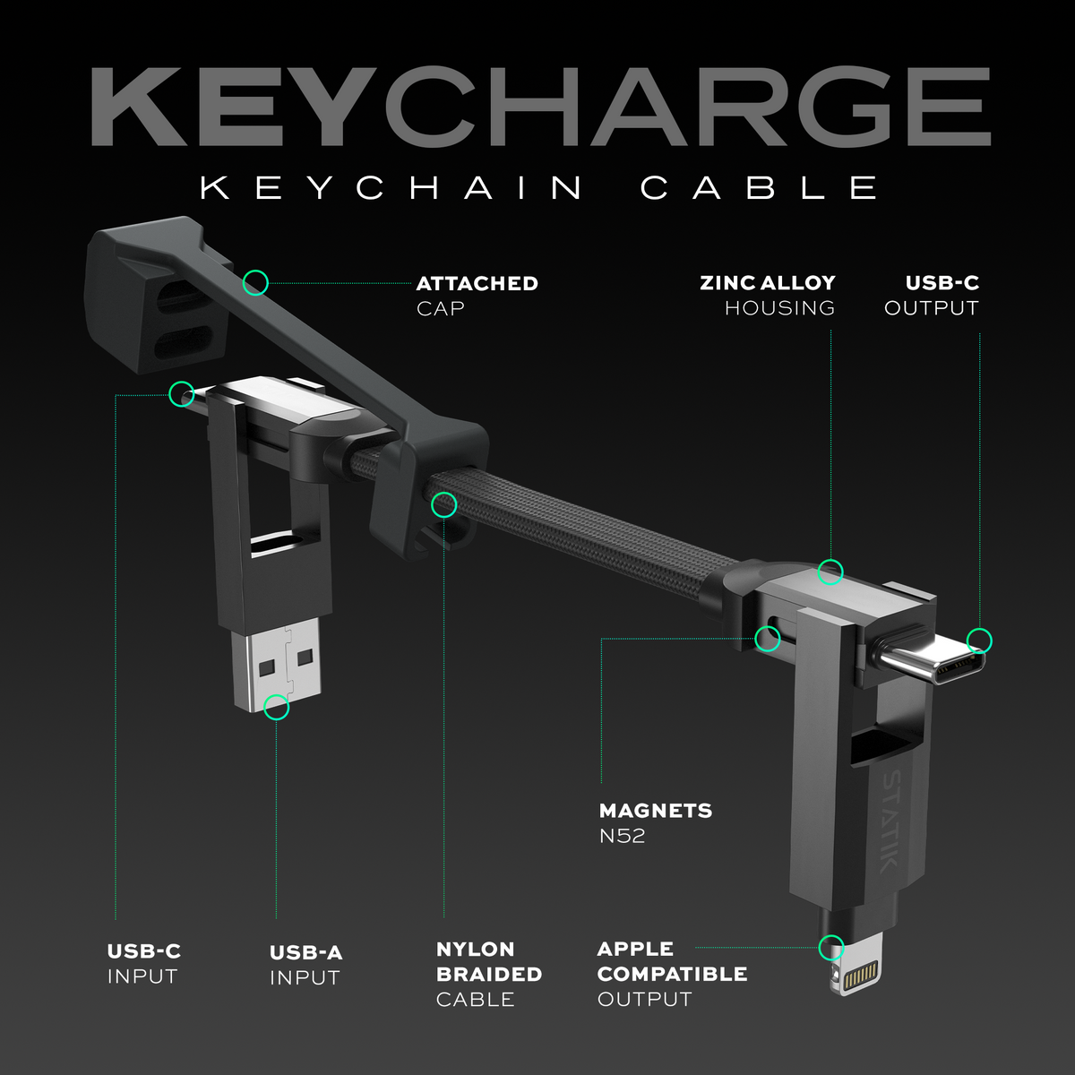 THE ONLY CABLE YOU'LL EVER NEED, KEYCHAIN READY! The Improved KeyCharge 2.0 is the ultimate 4-in-1 charging cable, offering universal compatibility to connect any portable device to any power source. Featuring USB-C to USB-C, USB-C to Lightning, USB to USB-C, and USB to Lightning capabilities, it simplifies your charging life. Its 60W fast charging and high-speed data transfer are packed into a durable, key-ring-friendly design, ensuring you stay powered and connected wherever you go.
